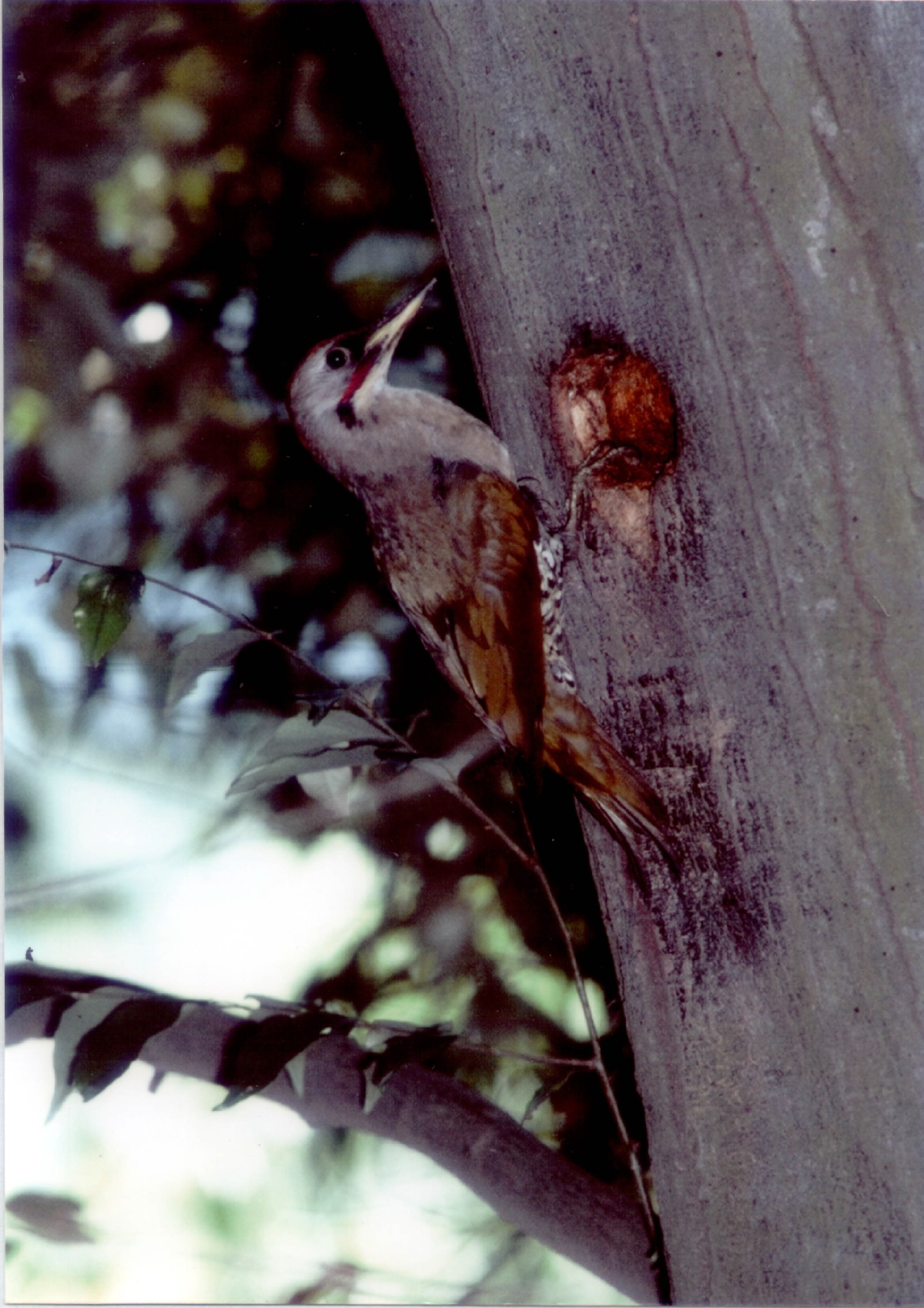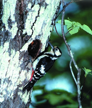 | ●アオゲラとその巣穴 木の幹に穴をあける。 中の様子は、巣の断面写真を参照のこと。 |