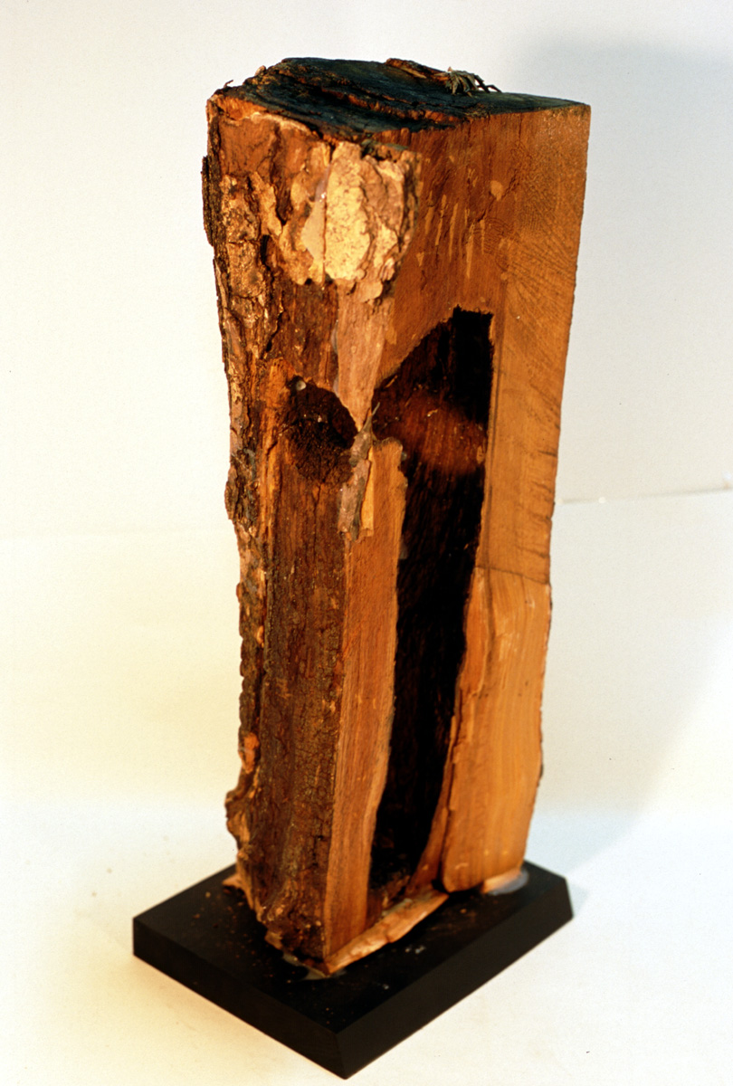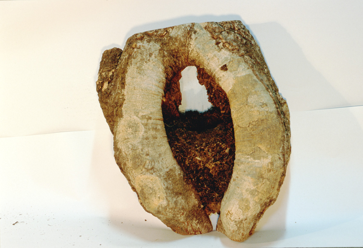 | ●アオゲラの巣(小海途コレクション) 木の幹に穴をあける。写真は断面を見せたもの。 |