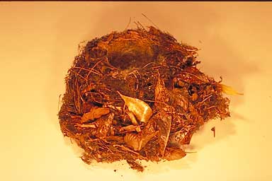 コケ、落ち葉などを使ったお椀形の巣で、産座に葉脈、獣毛などを敷く