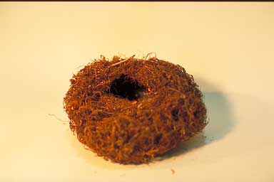 コケを使った横に入口のあるボール形の巣で、産座にリゾモルファ−などを敷く