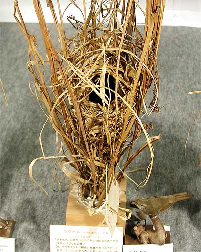 ササやススキの細長い枯葉を巻くようにした斜め上方に入口のあるボール形の巣で、産座に繊維などを敷く