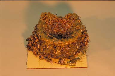 泥と枯草などを混ぜたお椀形の巣を壁に付け、産座に細い枯草などを敷く