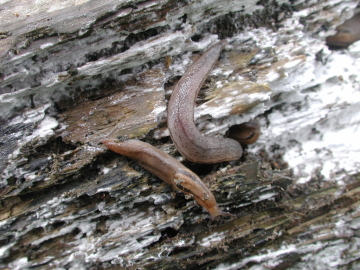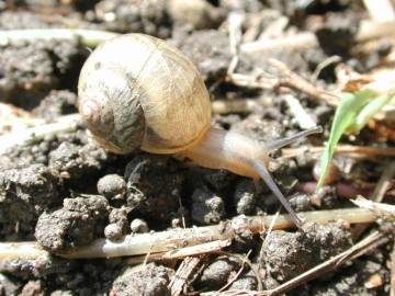 | 草むらや畑にはウスカワマイマイというカタツムリがいます。畑では農作物を食い荒らすので嫌われています。林にいる大形のカタツムリとは違って、大きさは直径2.5cmまでの小型種で、木の生えていない地面にすんでいます。乾燥がきらいで昼間はたいていかくれているので、草の根元や石の下などの湿ったところをさがしましょう。雨の後や夜に活動するので、そんな時にさがすのもいいでしょう。4月〜6月に土の中の浅いところに卵を産み、卵は2〜3週間で孵化します。子どもは親と同じかたちで生まれてきます。 同じところにいるナメクジのなかまも、じつは殻の退化した貝です。ナメクジは、植物そのものではなく、湿ったところに発生する微小な菌類をえさとしているので、家の中まで入ってきます。近年は、ナメクジに代わって、チャコウラナメクジという小さな貝殻を持ったナメクジのなかまが増えています。 |