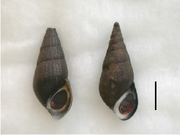 谷筋の流れの中にはカワニナが岩などにくっ付いているのがみられます。水の流れている場所ではカワニナがふつうですが、水のよどんだところには