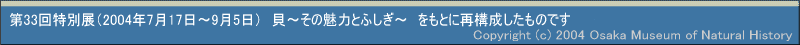 貝の化石は、5億年以上前の地層から見つかる歴史の長い生物です。今は巻貝や二枚貝が栄えていて、みんなの食べ物になったり、貝殻は石器時代から飾り物や道具として利用されてきたので、おなじみです。貝のことを調べて、もっと親しくなってください。 |