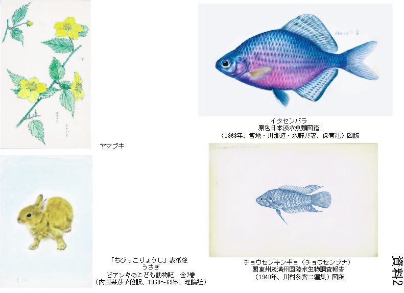 牧野四子吉(1900〜1987)まきの よねきちは生物を対象とした精緻な画風の20世紀の画家です。3万点を超える挿絵を図鑑や事典・辞典に著したことで知られ、そのような挿絵を「生物生態画」(資料1上)という独立した分野にまで高めた功績が高く評価されています。挿絵が使われた書籍類は教科書なども含めると100冊を超え、私たちは子どもの頃から今日に至るまでに知らず知らずのうちに四子吉の絵に接してきているはずです。