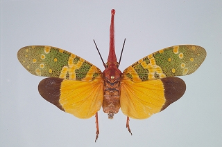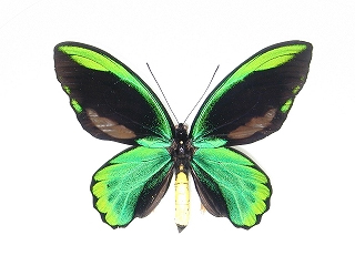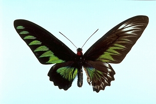 アカエリトリバネアゲハ雌雄型アカエリトリバネアゲハは、マレー半島、スマトラ島、ボルネオ島などに生息する美麗種。雌雄型とは、1匹がオスとメスの両方の特徴をもつ異常個体で、何万分の一の確率で出現すると言われている。この個体は、左がオスで右がメスの完全左右雌雄型である。