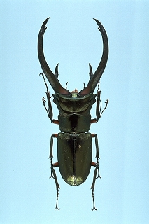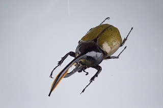 ヘラクレスオオカブトムシ体長50mm〜165mm。中南米に生息する世界で最も体長の大きなカブトムシ。体長の半分近くをしめる長い角はメスやエサ場をめぐる闘争に使われる。