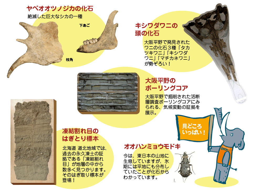 この特別展では、気候変動がおきる仕組みを紹介し、過去の歴史を振り返ります。気候変動により自然の様子がどのように変化してきたのかを、マンモス、ナウマンゾウ、ヤベオオツノジカなどの動物化石、大阪平野の地質資料、過去7万年の堆積物などの資料を中心にご紹介します。