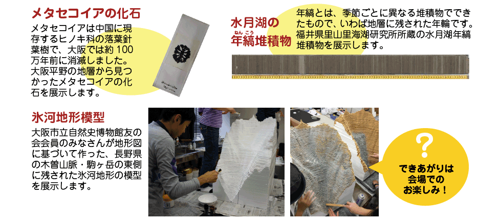 大阪の周りの丘陵には大阪層群と呼ばれる約 300万年前~ 35万年前の地層が分布しており、たくさんの植物化石が見つかっています。それらの中には、メタセコイア、セコイア、フウなど日本から消滅した植物が多く含まれています。交野市にある大阪市立大学理学部附属植物園で大阪層群の時代にあった植物の生きている姿を観察し、過去の森を思い浮かべてみましょう。