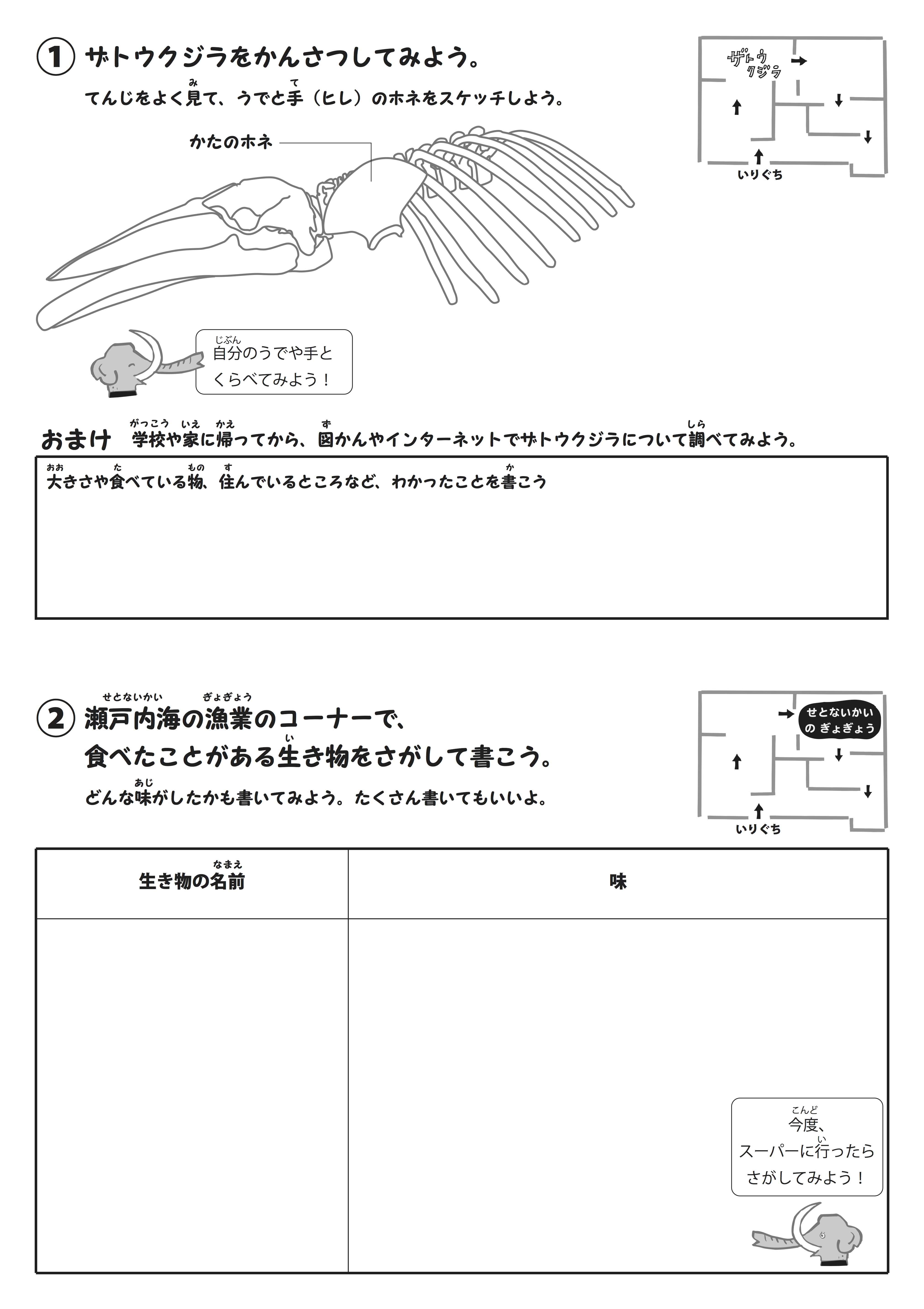 このワークシートは、小学生の皆さんが特別展示室内でグループワークなどを行うために作成しました。遠足などの参考にキッズマップも公開しています。