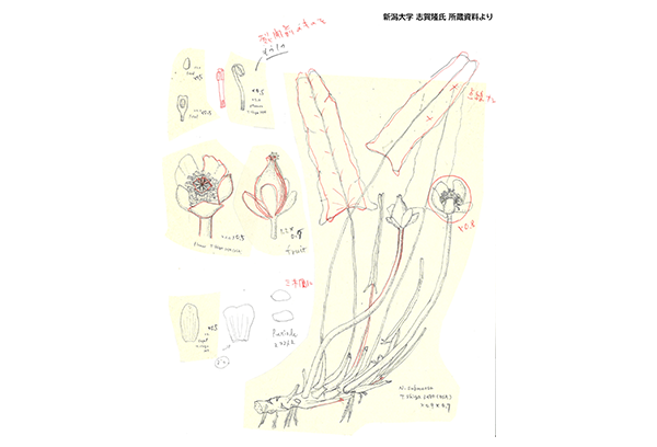 天木氏が残した植物の細密画は花の解剖図から根や地下茎などの地下部まで詳細に描かれており、天木氏の伝わる挿絵はこういった細部の観察が基礎になっているのだと思われる。(東京大学総合研究博物館所蔵、同館写真提供)
