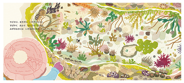 潮が引いた磯に現れたタイドプール(潮だまり)の魅力をイラストで伝える。