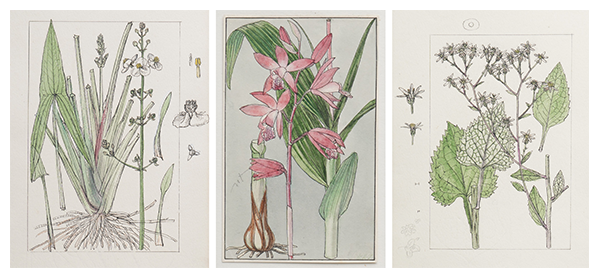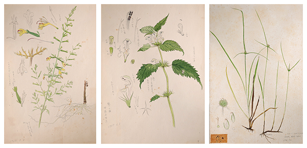 右:オモダカ(オモダカ科)。裏面には「牧の先生ト(府下大崎ニテ採集)とあり、牧野と一緒に採集したものから描いたようだ。中央:シラン(ラン科)。一番下の花には「トル」という書き込みがあり、誰かの校閲を受けていたことがわかる。右:シラヤマギク(キク科)。裏面には「牧野先生ト松戸ニテ」というメモと花の形態に関するメモがある。表面の欄外には2種類の頭花の図があり、形態を確認しながら描いていたようだ。(東京大学総合研究博物館所蔵、同館写真提供)