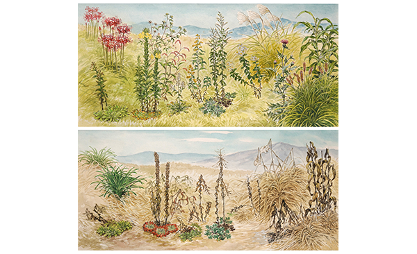 草はらに生きる植物について、同じ場所で季節を変えて、個々の植物を強調して描いている。冬であってもロゼット葉でしっかりと生きている様子がわかりやすく描かれている。(東京大学総合研究博物館所蔵、同館写真提供)