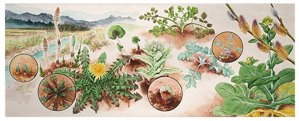 ツクシ、タンポポ、フキ、セリなど早春の河辺の植物に加えて、コマツナ類やネコヤナギなども含めて春の様子がよくわかる絵。丸の中に芽出しの様子も書き込まれており、植物の生き様がよくわかる。(東京大学総合研究博物館所蔵、同館写真提供)