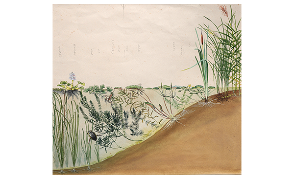 ため池の岸からの水深の変化に応じて生育する水草が変わっていく様子がきれいに描かれており、水草の生活が一目でよくわかる一枚。(東京大学総合研究博物館所蔵、同館写真提供)