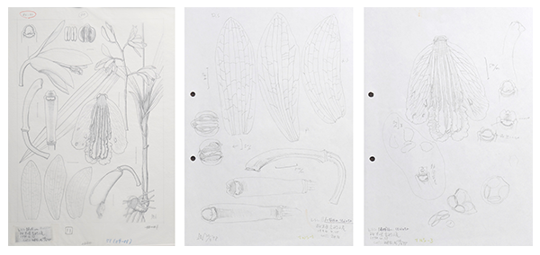 左:図鑑に掲載された図の原図。1枚の図に地下部を含めた全体、花、花の解剖図がレイアウトされており、シランの構造がよくわかる。中央・右:花の解剖図の下書き。標本を確認しながら花の解剖図を描いていく。(東京大学総合研究博物館所蔵、同館写真提供)