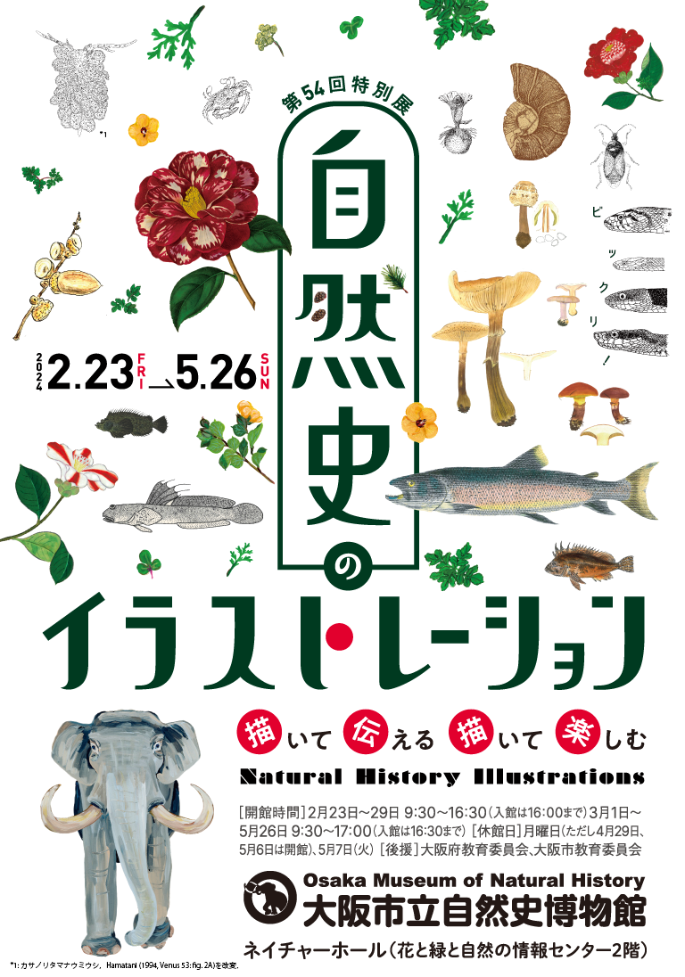 本展では、古い文献、論文や図鑑、普及のための資料など、様々な媒体に描かれたイラストレーションを通して、描かれたものの魅力と描いて伝えることの楽しさを紹介します。ペリーの航海記に描かれた日本の生き物の図、化石で新種記載された松ぼっくりの原画、潮の満ち引きに関する絵本の原画、大阪市立自然史博物館友の会会員の詳細な観察スケッチなど、時代やジャンルも幅広いイラストレーションを展示し、誰もが写真を気軽に撮れる今の時代にこそ、絵や図の面白さを考えてみたいと思います。