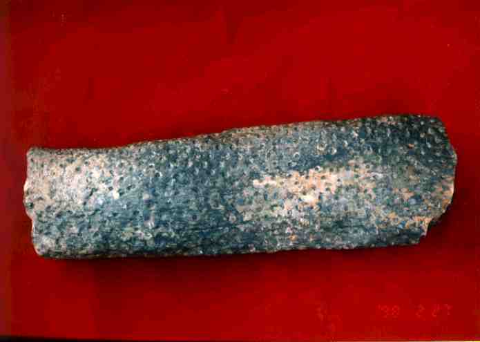 (1)スティグマリア:石炭紀に繁栄したリンボク類や封印木類(シダ植物)の樹幹を支えていた地下部の化石。表面には根の出ていた跡がらせん状に見られる。石炭紀の湿地には、リンボク類などのシダ植物が高さ30mにもなり、大森林を形成していた。