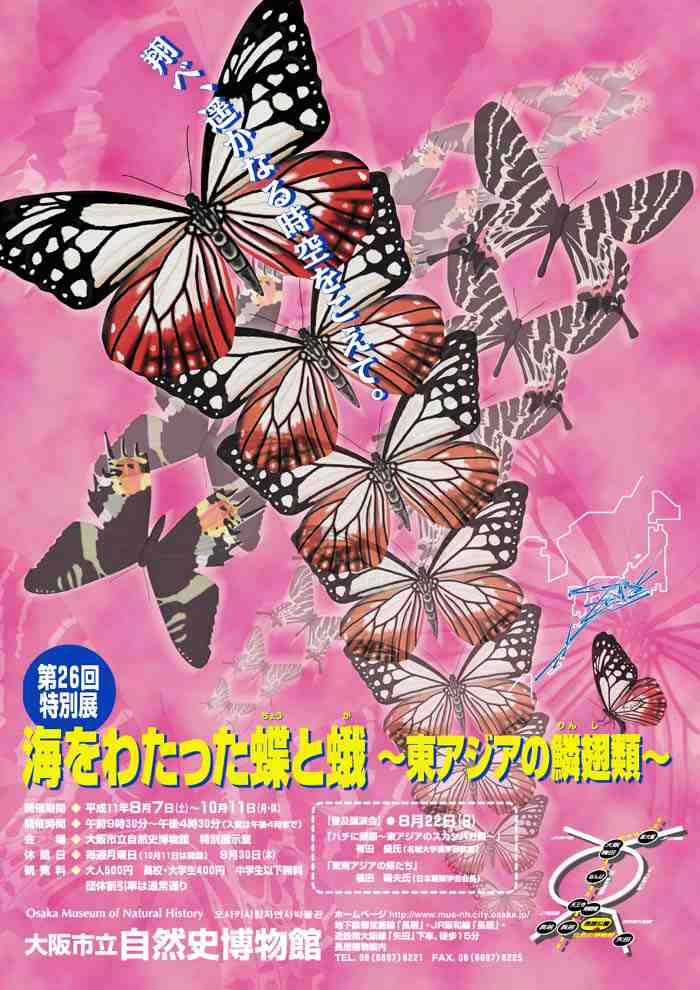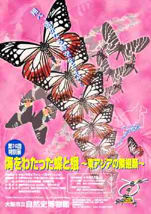 今回の特別展では、「日本の蝶蛾相の成立過程」と「蝶蛾がいかに生活しているか」の二つの大きなテーマを扱います。まず、蝶蛾の特徴と生活を紹介し、春_初夏の北上と秋の南下移動を繰り返す、「渡り」をする蝶として有名なアサギマダラにスポットをあてながら、その移動の実態を展示し、移動の謎に迫ります。アサギマダラとは対称的に、メスにハネがなく、移動能力がとぼしいオオミノガなどのミノムシの生活も紹介します。さらに、日本の蝶蛾を「日本の昆虫のふるさと」とも呼ばれている中国大陸、朝鮮半島、台湾のものと比較することで、日本の蝶蛾相の特徴を浮き彫りにして、成立過程を推定する予定です。あわせて、「三草山のゼフィルスの森」、「和泉葛城山のブナと蛾」などのコーナーを通じて、蝶蛾の生活と自然保護について考える場を提供します。
