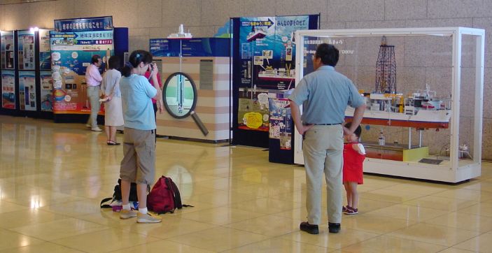 10月30日(土)〜11月7日(日)の間,自然史博物館本館2階特別展示室において,市民向けに,IODPの科学的な意義をわかりやすく解説するパネルや,地球 深部探査船「ちきゅう」と掘削装置の模型などを展示するとともに,広報ビデオの上映を行います.10月31日の講演会に参加できない方も是非ご覧ください.