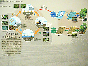 水田は人がつくり、維持してきた水たまりです。私たちのひいおじいさんの時代とは違い、稲作の時期以外には水を抜き、農薬を使うようになったことから、この水たまりで生活していた多くの生き物たちは消えていきました。また、耕作を放棄することによって、生き物のくらしはどのように変わったでしょうか。