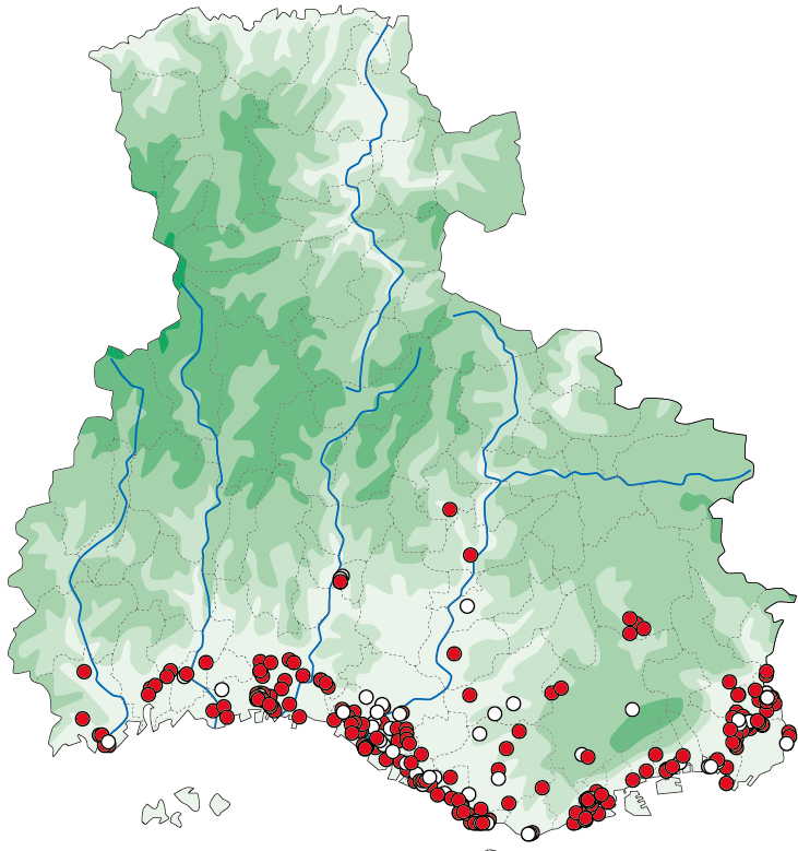 1993年に、高松市多肥下町での確認が最初です。その後、主に丸亀市周辺に定着しました。現在は、観音寺市から東かがわ市まで広く分布していますが、東かがわ市の情報は少ないようです。