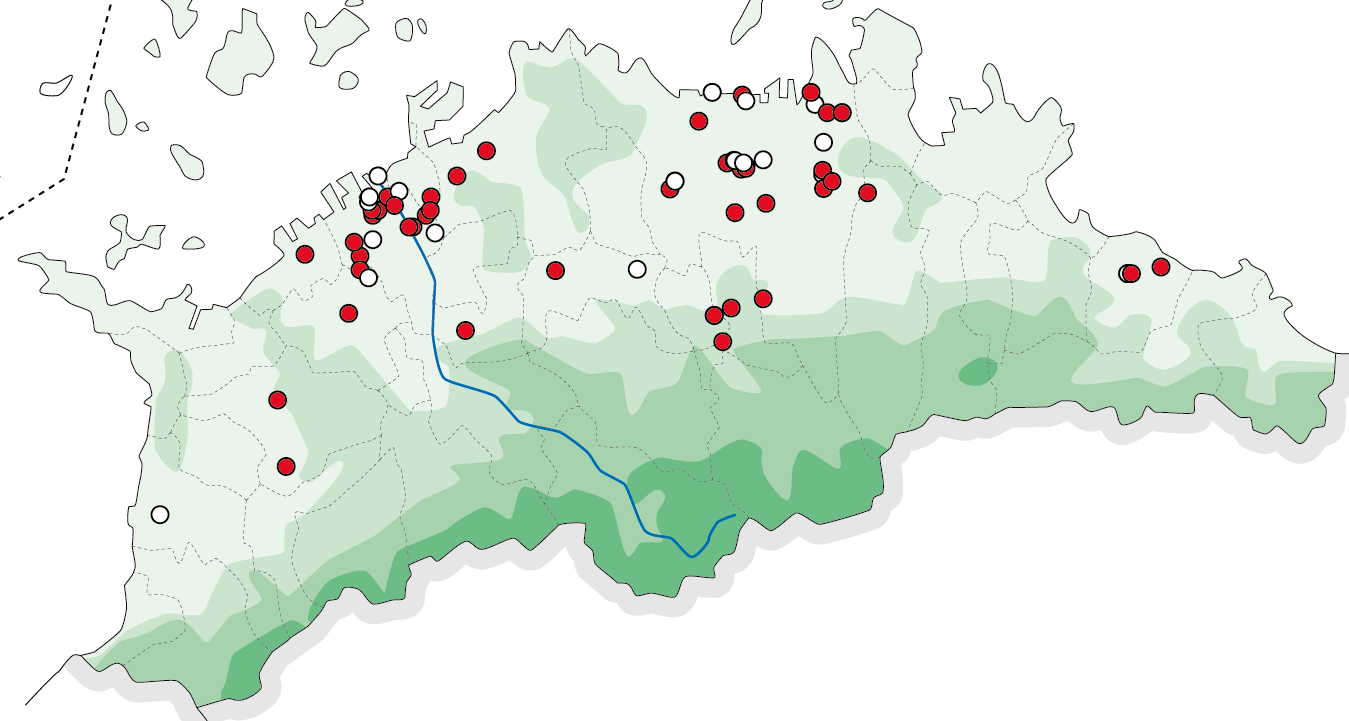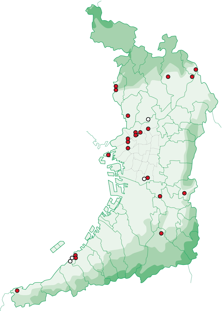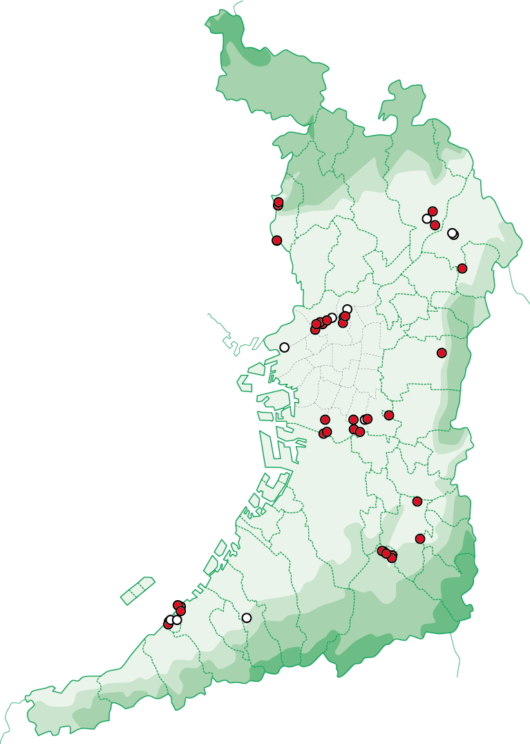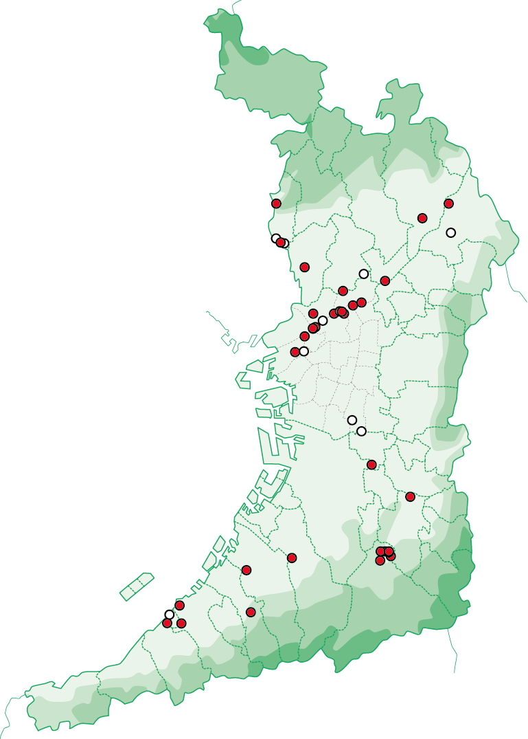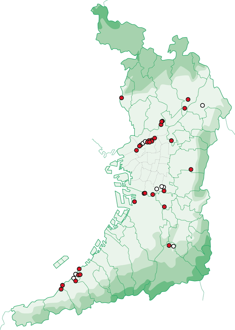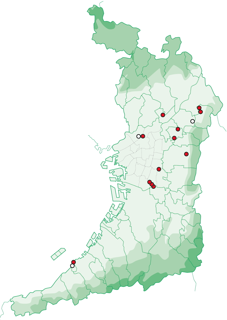 手元にある情報に基づく分布図は以下の通りです。以下の分布図からわかるように、おおむね2014年以降、大阪平野全体に分布が広がっていますが、一方で生息地は面的に広がらず点在したままです。今後、この分布が面的になっていくのか注目しています。