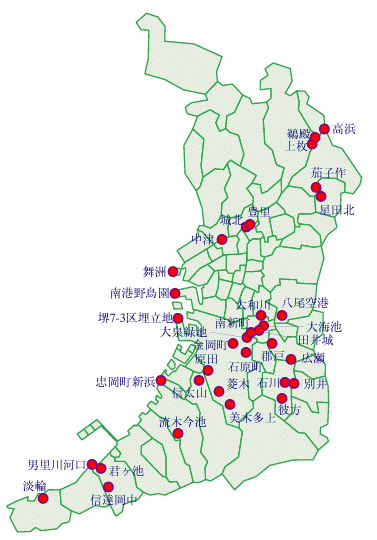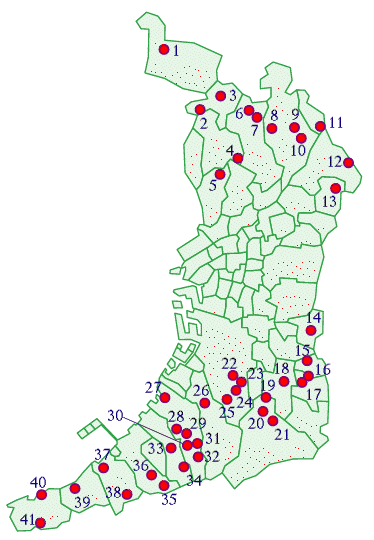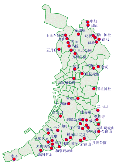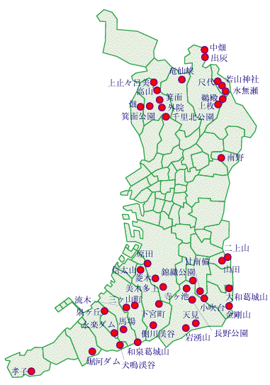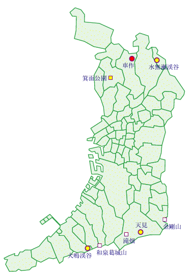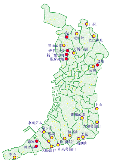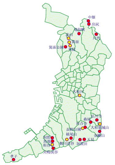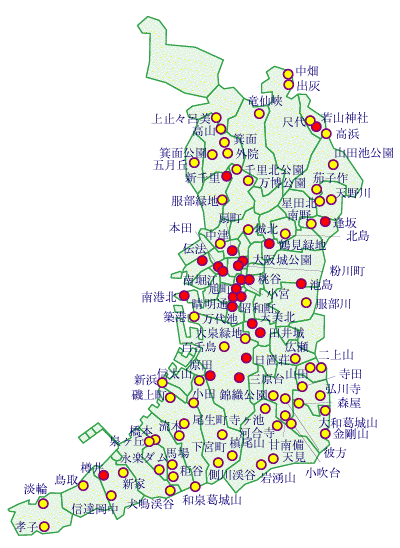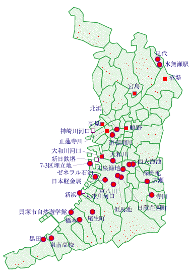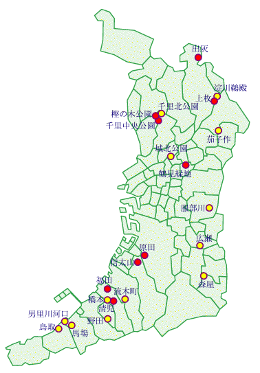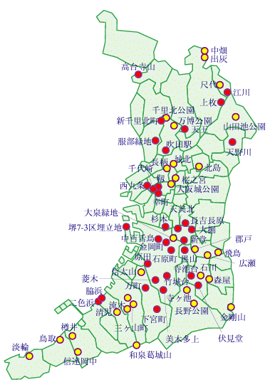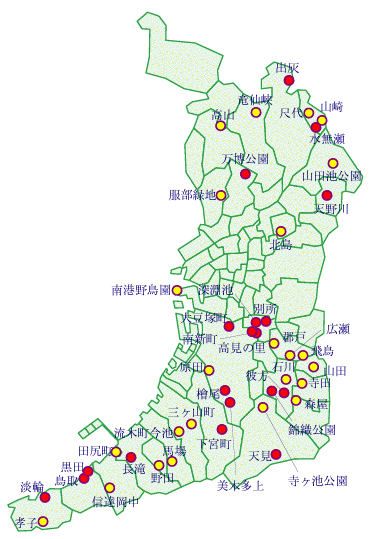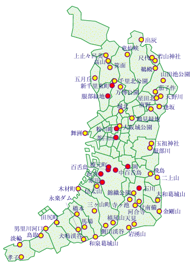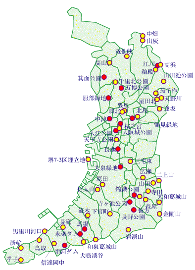 観察記録の場合、1990年以降の繁殖確認は赤丸、繁殖期(4月-7月)の生息確認は黄丸で示す。文献記録の場合、1990年以降ならば繁殖確認は赤四角、繁殖期(4月-7月)の生息確認は黄四角で示し、1989年までならば繁殖確認は白四角、繁殖期(4月-7月)の生息確認は白逆三角で示す。