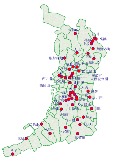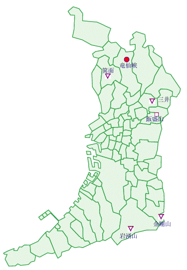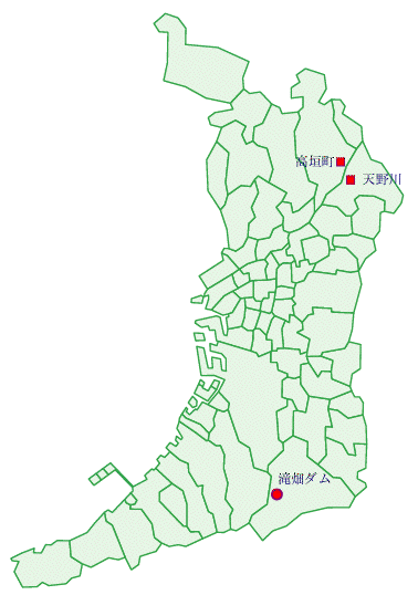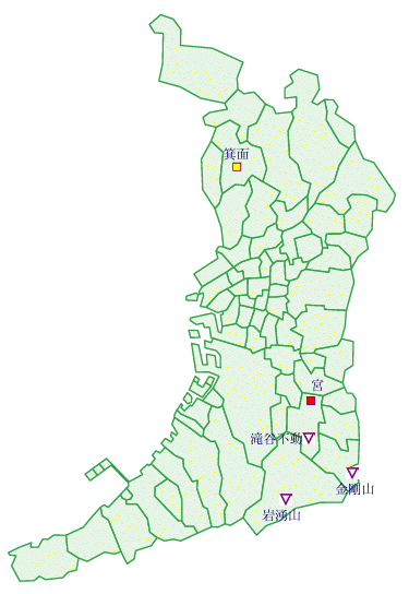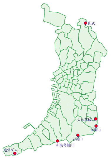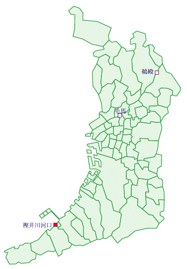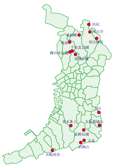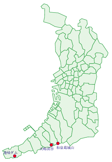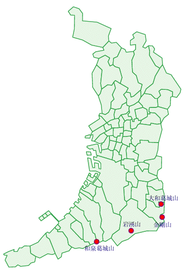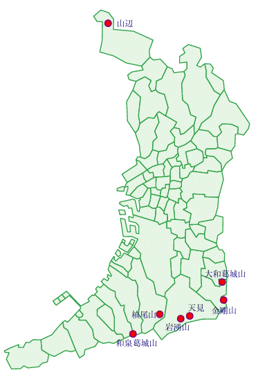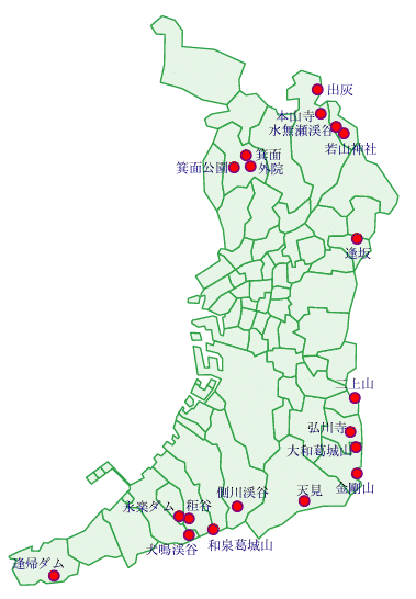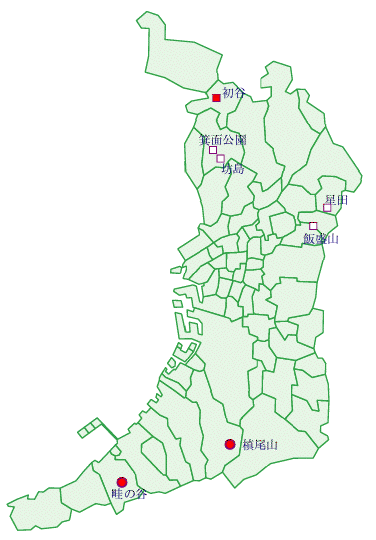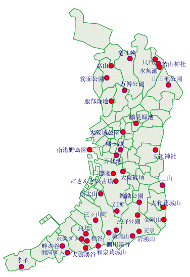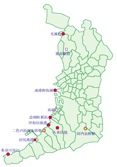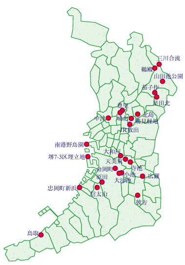 観察記録の場合、1990年以降の繁殖確認は赤丸、繁殖期(4月-7月)の生息確認は黄丸で示す。文献記録の場合、1990年以降ならば繁殖確認は赤四角、繁殖期(4月-7月)の生息確認は黄四角で示し、1989年までならば繁殖確認は白四角、繁殖期(4月-7月)の生息確認は白逆三角で示す。