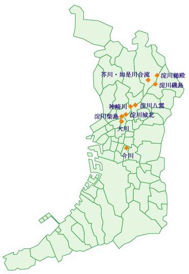 1990年以降の標本記録は赤丸、1970年〜1989年の標本記録は黄丸、1969年以前の標本記録は白三角で示してある。1990年以降の観察記録は、橙菱形。1990年以降の文献記録は赤四角、1989年以前の文献記録は白四角で示してある。