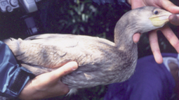 2001年4月に伊丹市昆陽池において、近畿地方で初めてカワウのヒナへの標識調査が行なわれました。その際、捕獲しなくても各個体の移動状況が追跡できるよう、脚にカラーリングが装着されました(ユリカモメと同様、京都市の須川恒さんが中心になって行なっている調査です)。その後、昆陽池以外に、琵琶湖の竹生島でも標識が行われています。
