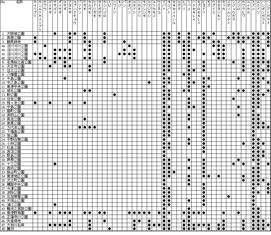 大阪府都市公園一覧表1994年3月31日版によると、大阪市内の2ha以上の公園は42ヶ所。このうち2ヶ所は現存しなかった。逆に載っていなかった緑地6ヶ所を付け加え、さらに淀川は4つに分割した。その結果、調査地は49ヶ所となった。リストはNo.41までは面積の大きい順に並べてある。