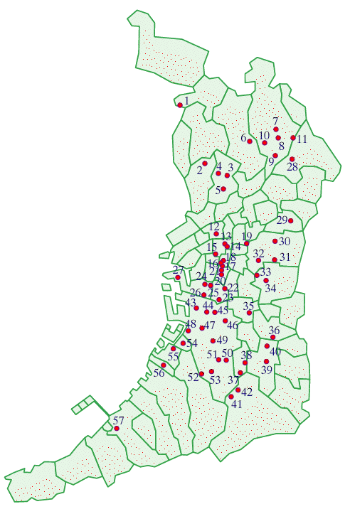 1.豊能町光風台2:池田銀行前、2.豊中市緑丘4、3.吹田市五月ヶ丘、4.吹田市津雲台1:阪急南千里駅前、5.吹田市片山町:吹田市民病院、6.茨木市花園町:太田小学校、7.高槻市古祖部町:高槻病院、8.高槻市大学町:大阪医科大学、9.高槻市登町、10.高槻市朝日町:明治製菓、11.高槻市:淀川鵜殿、12.北区曾根崎新池1:御堂筋西側、13.中央区大手前町3:家庭裁判所北西、14.中央区馬場町:NHK玄関前、15.中央区難波3:御堂筋東側、16.天王寺区茶臼山:慶沢園、17.天王寺区悲田院町:天王寺交差点北東角、18.天王寺区逢坂2-3:谷町筋沿い、19.城東区諏訪町3:成城工業高校、20.阿倍野区阿倍野元町:阿部王子神社北東角、21.阿倍野区阿倍野筋3:阿倍野交差点北東角、22.住吉区長居東3:長居小学校北側、23.住吉区杉本:大阪市大理学部前、24.住之江区西加賀屋町:北加賀屋駅南側、25.住之江区粉浜、26.住之江区北島3、27.住之江区南港中、28.枚方市岡東町12:京阪枚方市駅前、29.大東市野崎1:JR野崎駅前商店街、30.東大阪市箕輪:箕輪公園、31.東大阪市玉串元町2、32.東大阪市小若江3:近畿大学、33.八尾市:久宝寺緑地、34.八尾市安中町:JR八尾駅前、35.松原市上田6:樋野ヶ池、36.羽曳野市広瀬:石川河川敷、37.大阪狭山市大野台4:近大病院、38.大阪狭山市半田1:南海金剛駅西側、39.富田林市常盤町:富田林市役所前、40.富田林市旭ケ丘:旭ケ丘南交差点北側、41.河内長野市下里町:西除川沿い、42.河内長野市小山田町:西除川沿い、43.堺市竜神橋町:南海堺駅南口、44.堺市南瓦町:裁判所北側、45.堺市北三国ヶ丘4〜向陵西町1、46.堺市新金岡町1:新金岡公園、47.堺市上野芝町2:JR上野芝駅北側、48.堺市諏訪ノ森町西2、49.堺市深井沢町:深井駅前、50.堺市三原台:三原台センターサミット、51.堺市竹城台1:泉ヶ丘駅北側、52.堺市鴨谷台:光明池駅前、53.堺市原山台5-1、54.高石市加茂1:スーパー西友東側、55.泉大津市:助松団地、56.忠岡町馬瀬、57.泉佐野市南中安松町:真城病院向かい