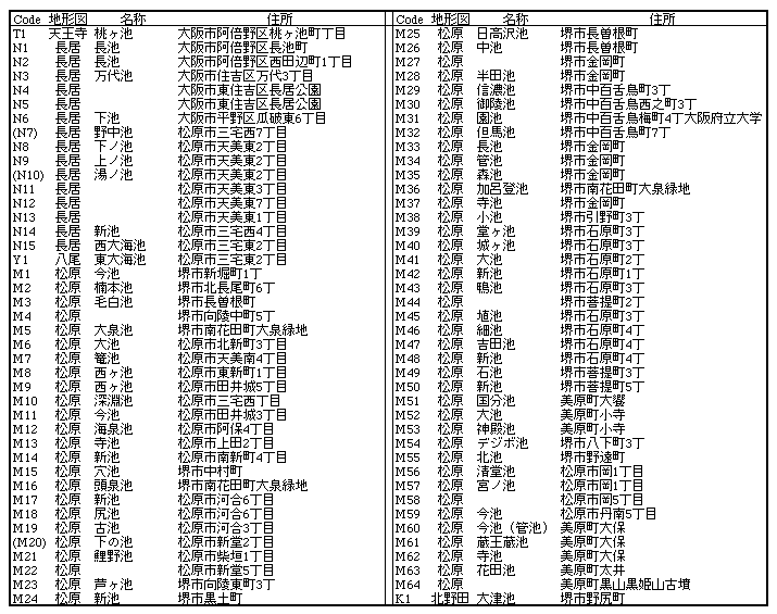1987年作成の国土地理院の10000分の1の地形図「長居」と「松原」に載っているすべての池を、基本的には調査対象にしました。ただし調査開始時点で存在しなかった16の池は調査のしようがありませんし、池の近くへ行くことが困難な3つの池と別に調査している長居公園の2つの池は調査対象からはずしました。また調査地域の境界付近にある「天王寺」の桃ヶ池、「八尾」の東大海池、「北野田」の大津池は調査対象に含めました。その結果、調査対象の池は77個になりました。