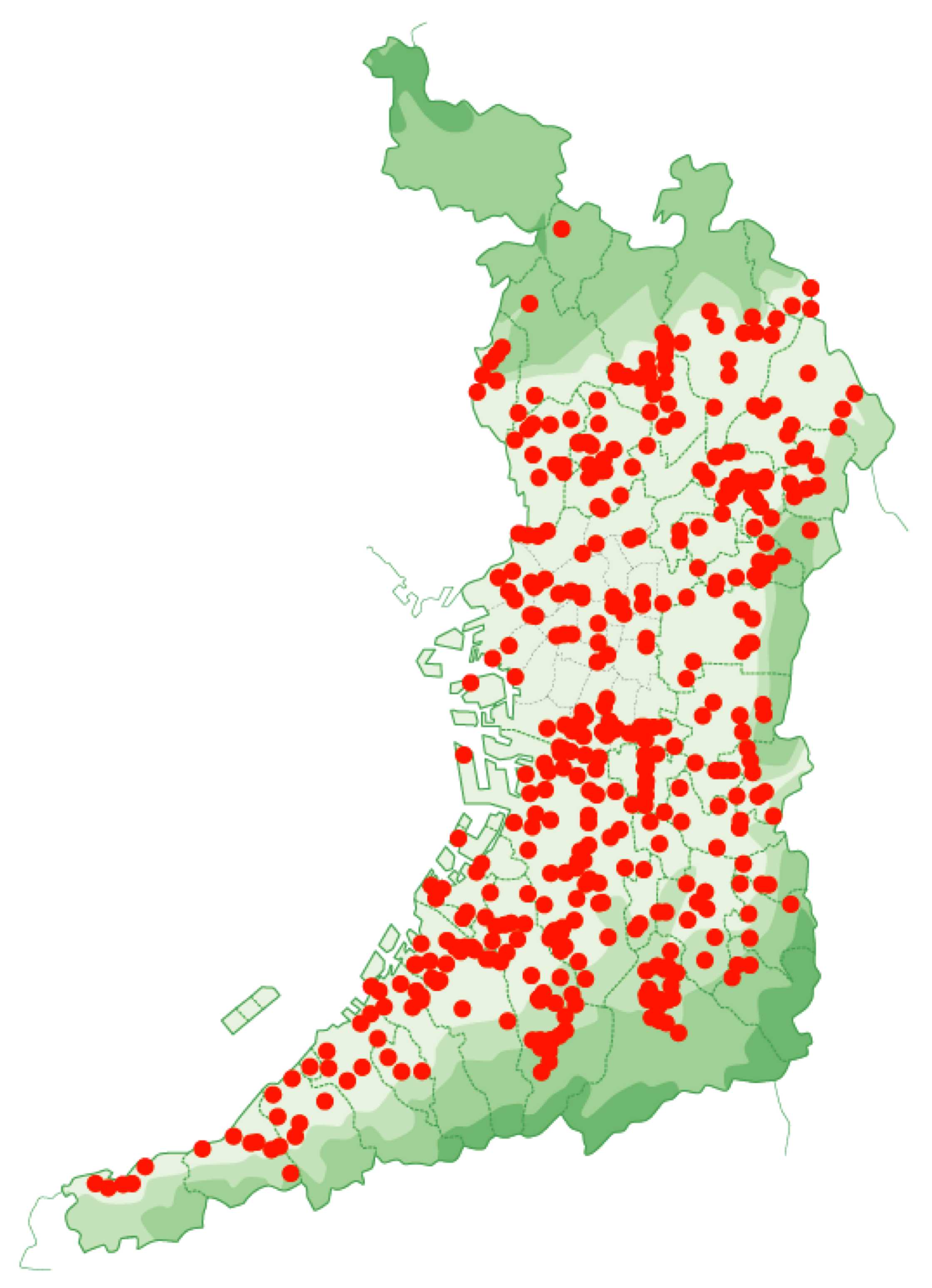 2007年の大阪府下でコウモリが飛んでいた地点。大部分がアブラコウモリと考えられますが、ヒナコウモリなど他のコウモリが混じっている可能性もあります。