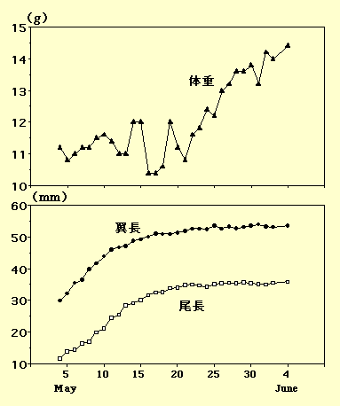 今日のスズメのスンちゃんの午後6時時点での計測値は、体重14.4g、翼長53.7mm、尾長36.0mm。昨日はついに測定できなかった。スンちゃんが館にやってきて1ヶ月を過ぎました。今日で、測定値を毎日公開するのはやめにしたいと思います。何かあればまた報告します。最後にスンちゃんの測定値の変化のグラフを載せておきます。